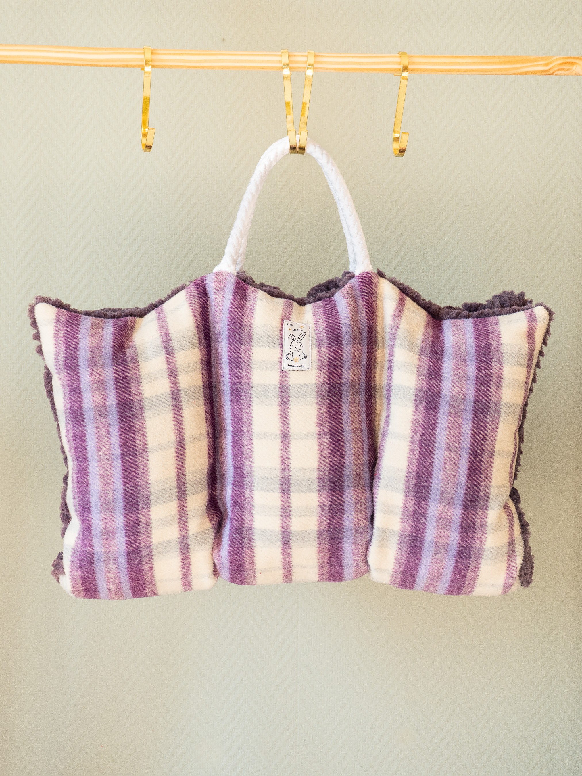 En mélange de lainage à carreaux violets très qualitatif et fourrure à poils courts aubergine au verso