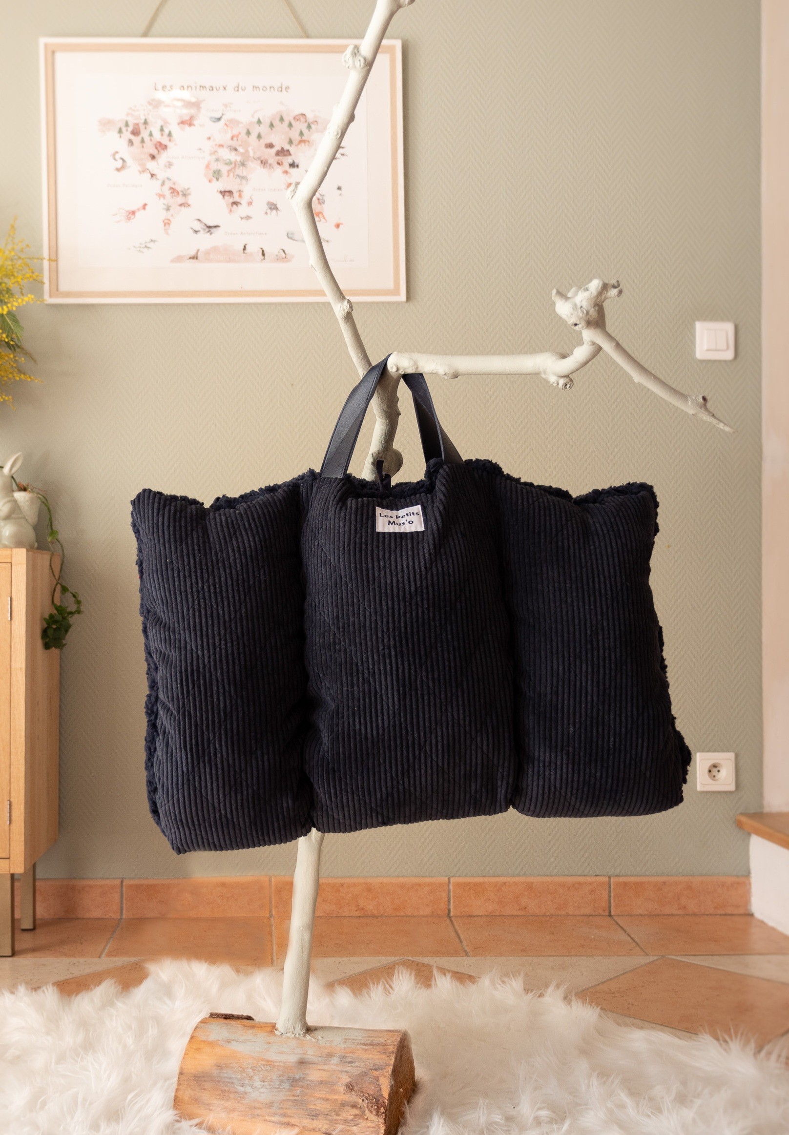 Matelas de voyage velours bleu : une face en velours côtelé bleu nuit et une face en fourrure sherpa