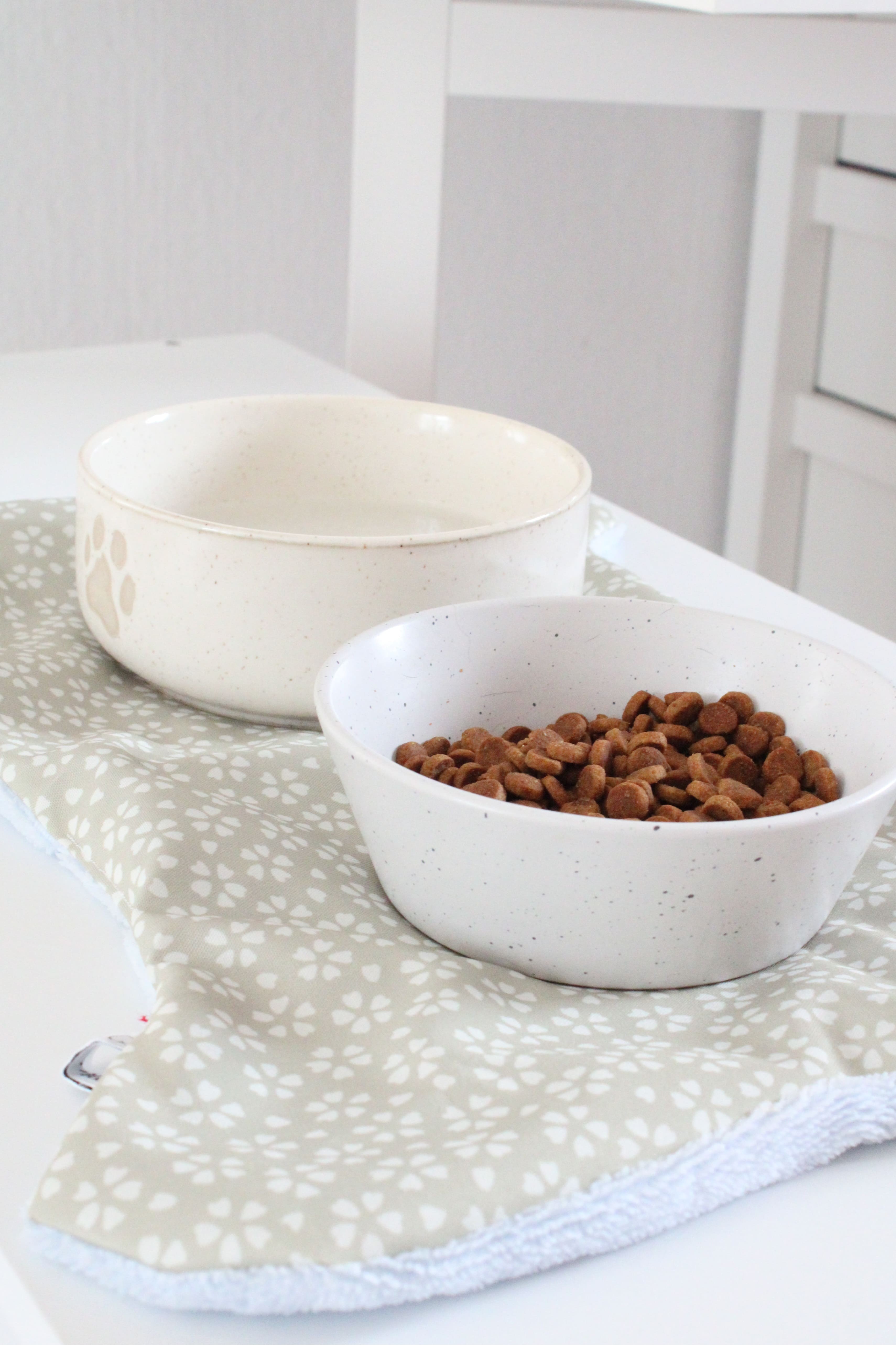 Tapis pour gamelles Vinca : avec une face en tissu outdoor facile à nettoyer et une face en éponge absorbante